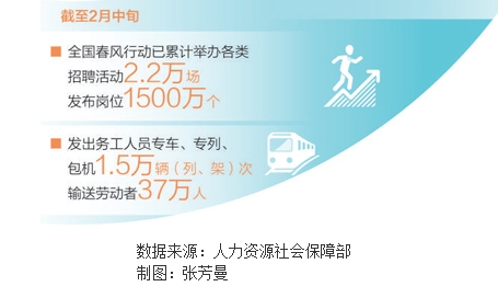 眼下,大批农民工陆续返岗,各地人社等部门积极开展春风行动,推出一系列就业服务活动,拓展就业增收渠道。记者从人力资源社会保障部获悉:截至2月中旬,全国春风行动已累计举办各类招聘活动2.2万场,发布岗位1500万个;发出务工人员专车、专列、包机1.5万辆(列、架)次,输送劳动者37万人。